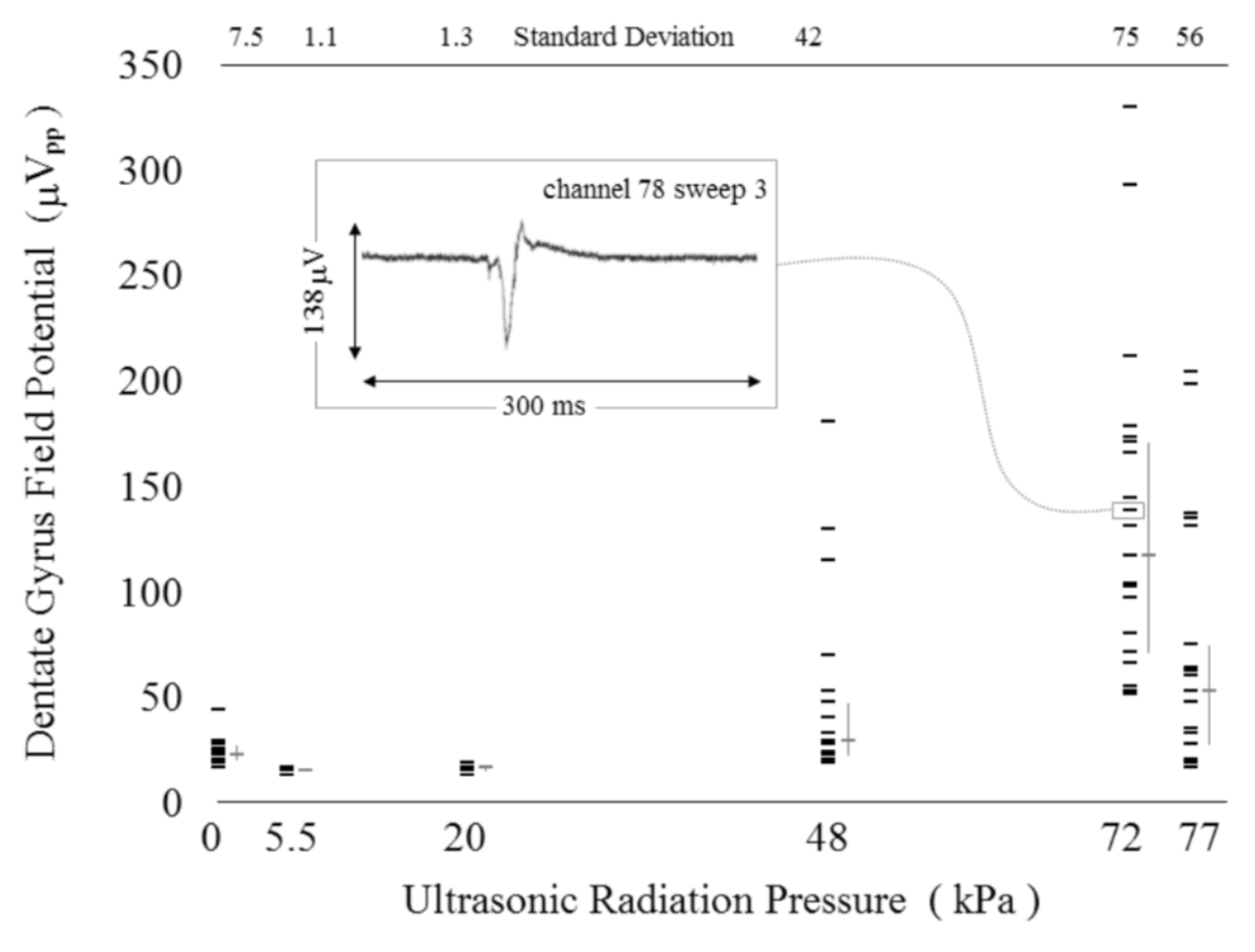 From Muratore R, LaManna JK, Lamprecht MR, Morrison, B. Bioeffects of Low Dose Ultrasound on Neuronal Cell Function, Proceedings of the 38th Annual Ultrasonic Industry Association Symposium, Vancouver, BC Canada, 2009 March 23 / 25. Response of a rat hippocampal slice culture to varying ultrasonic dose. The ultrasonic stimuli were 4.04-MHz, 100-μs pulses from a 42-mm diameter f/2.1 transducer. The focal region was aligned with the hippocampal surface, incident at about 45°. The gray bars to the right of the potentials represent the 1st, 2nd (median), and 3rd quartiles. The inset is a sample waveform from the third sweep of channel 78. The recordings were 300 ms in duration: 100 ms pre-stimulus and 200 ms post-stimulus, with an approximately 1-ms blanking period at stimulus onset.
